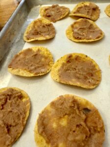 - Coat each chip with a thin layer of refried beans.