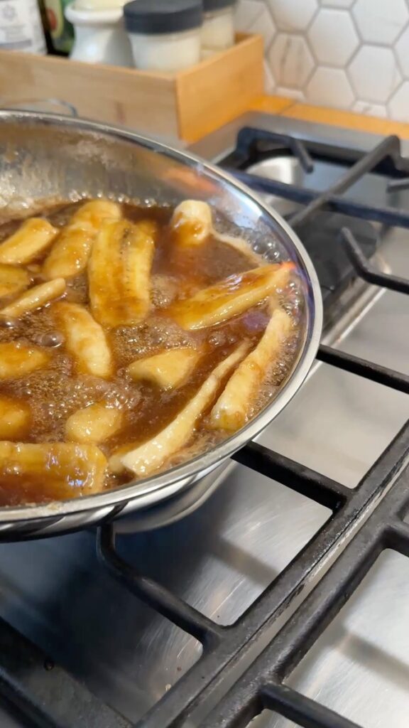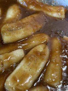 - As the sauce starts to caramelize, add the bananas.