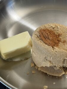 - In a stainless-steel skillet (to flambé safely), melt butter and add in brown sugar and cinnamon over medium heat.